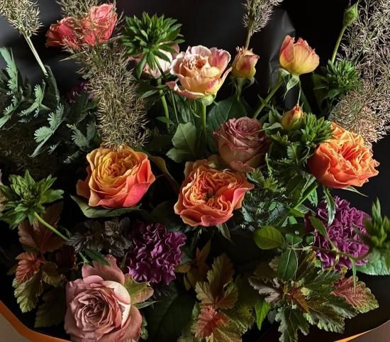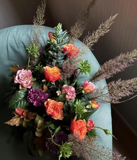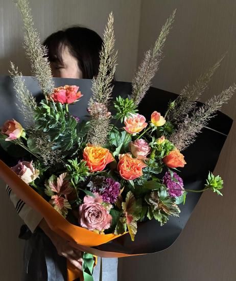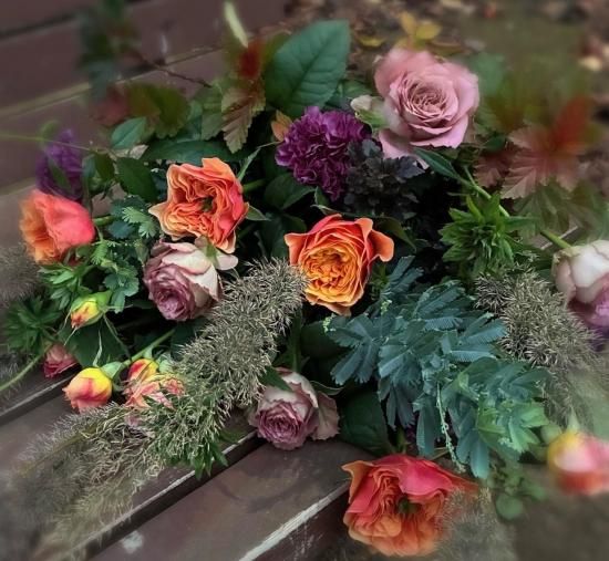 オレンジ色のグラデーションが美しいバラ「ケンジントンガーデン」や、珍しい品種・緑のスプレーバラ「リューイーソー」などと、秋色に紅葉した葉物、紫色のカーネーションなどを使用しました。