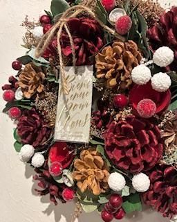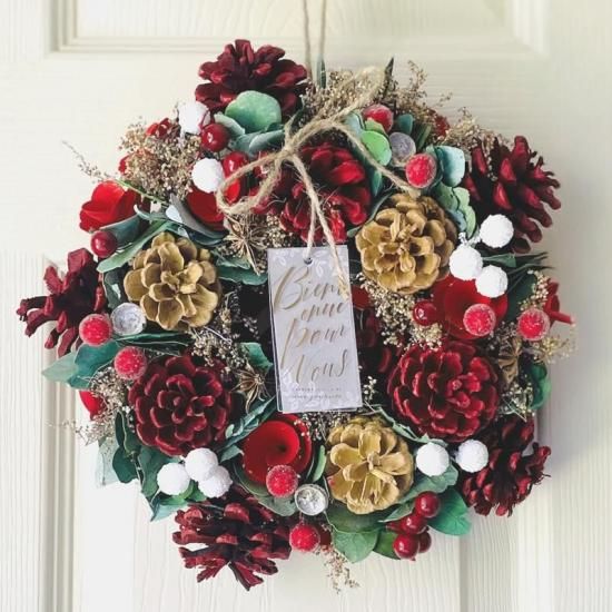 赤く染めた松かさや白い雪玉を模したボールなどをアレンジしたナチュラルティストのデザイン。
