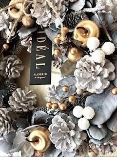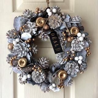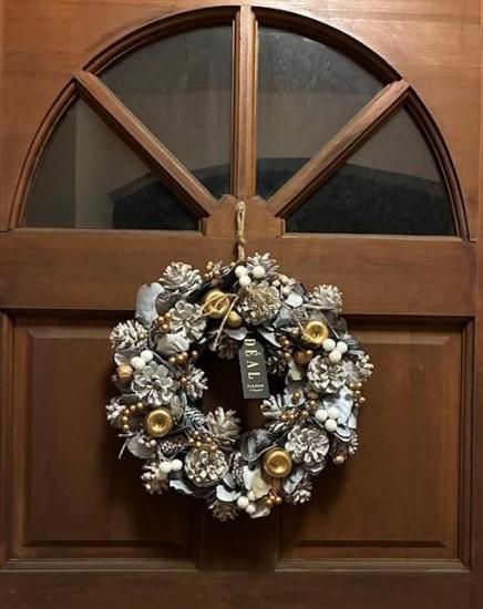 シルバーとゴールドに染めた松かさなどに黒いボードタグを飾ったシックで大人っぽいデザイン。