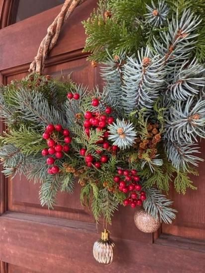 シルバーカラーのモミと実付きのヒムロ杉をハーフリースに仕立てた香り豊かなドア飾り。